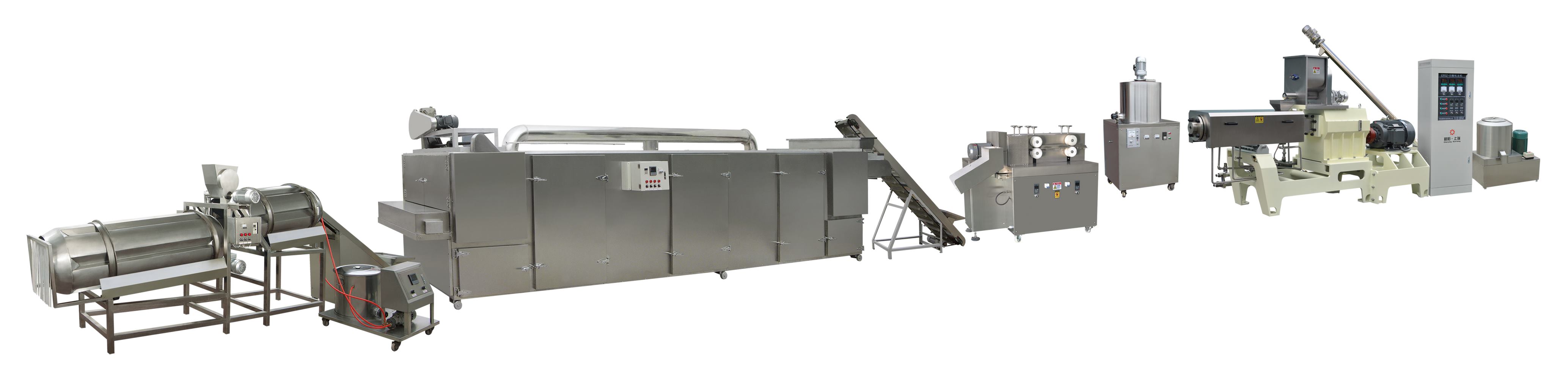 一、生產(chǎn)線工藝流程:原料配制→拌粉→輸送→擠壓膨化→注芯→切斷→輸送→干燥→噴油→調(diào)味→包裝