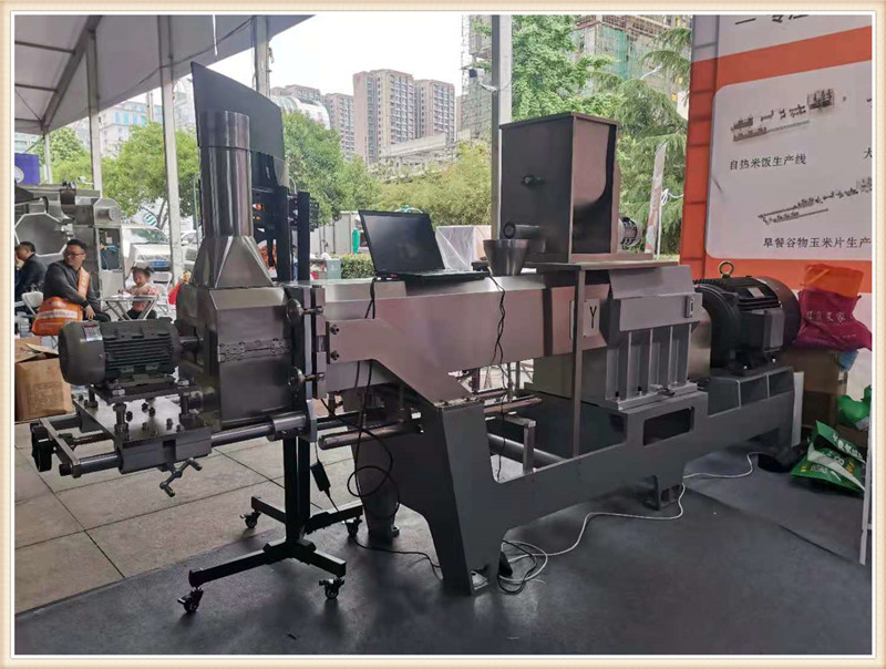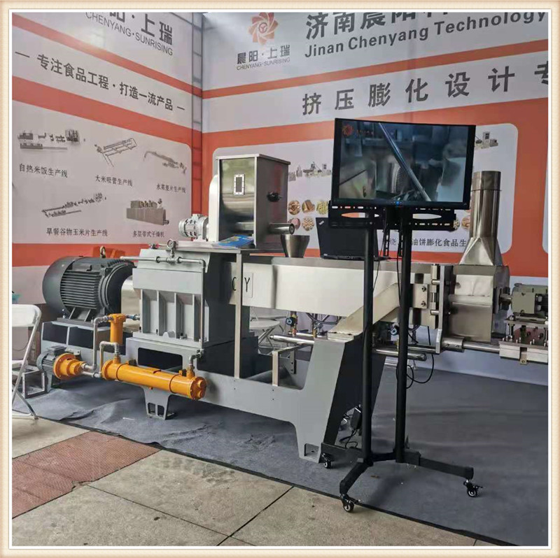 濟南晨陽公司攜帶新款CY65雙螺桿膨化主機亮相第19屆漯河食品博覽會,一經亮相,變引起了眾多膨化食品生產企業(yè)的關注咨詢。詳細詢問該新款機型的性能特點,和核心產品加工。該款65主機搭載45kw-6級電機直連傳動,齒輪箱使用原裝南京擠出機箱體,螺桿使用分段積木組合結構,機桶使用內壁噴涂耐磨襯套材料。機桶恒溫控制,PLC自動控制,切割模頭升級。