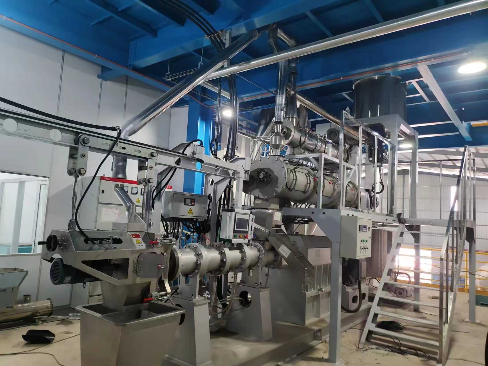 膨化:混合后的物料進(jìn)入雙螺桿擠壓膨化機(jī),在高溫高壓的條件下,原材料中的淀粉被膨化并轉(zhuǎn)化為可消化的形式,通過調(diào)節(jié)模具可以控制顆粒的大小和形狀