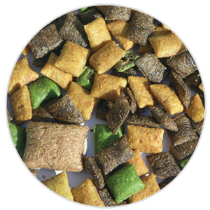 工藝方面寵物食品生產(chǎn)技術可將客戶的配方的體現(xiàn)在產(chǎn)品的形狀、大小、適口性、膨化度以及水分含量等,并可按照客戶要求著色、噴油、噴漿、噴粉以及成品自動混色(料)。