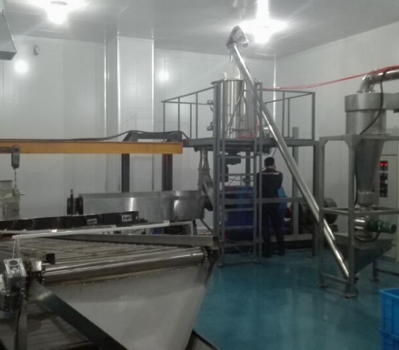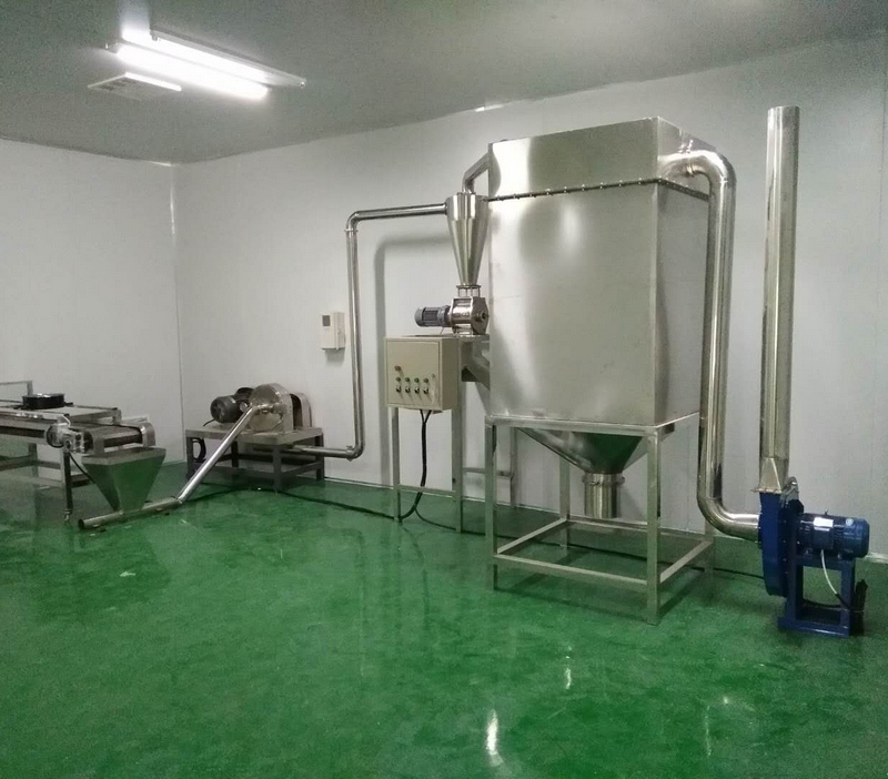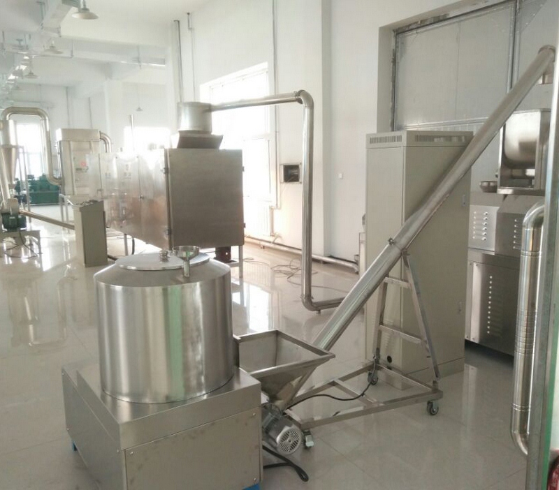 生產(chǎn)線構(gòu)成:拌粉機→螺旋提料機→膨化主機→冷卻輸送機→除塵粉碎機
