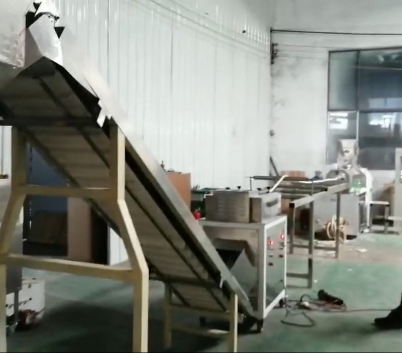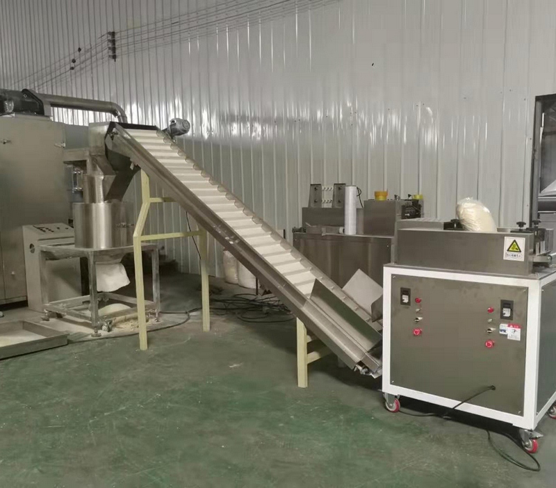 拌粉機(jī)→螺旋提料機(jī)→膨化主機(jī)→冷卻輸送-切斷機(jī)→提升機(jī)-粉碎機(jī)-除塵機(jī)-篩選機(jī)-提升機(jī)-震動(dòng)硫化床