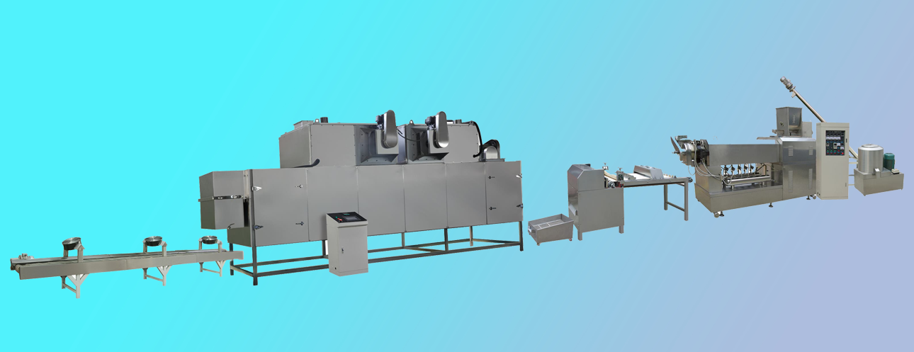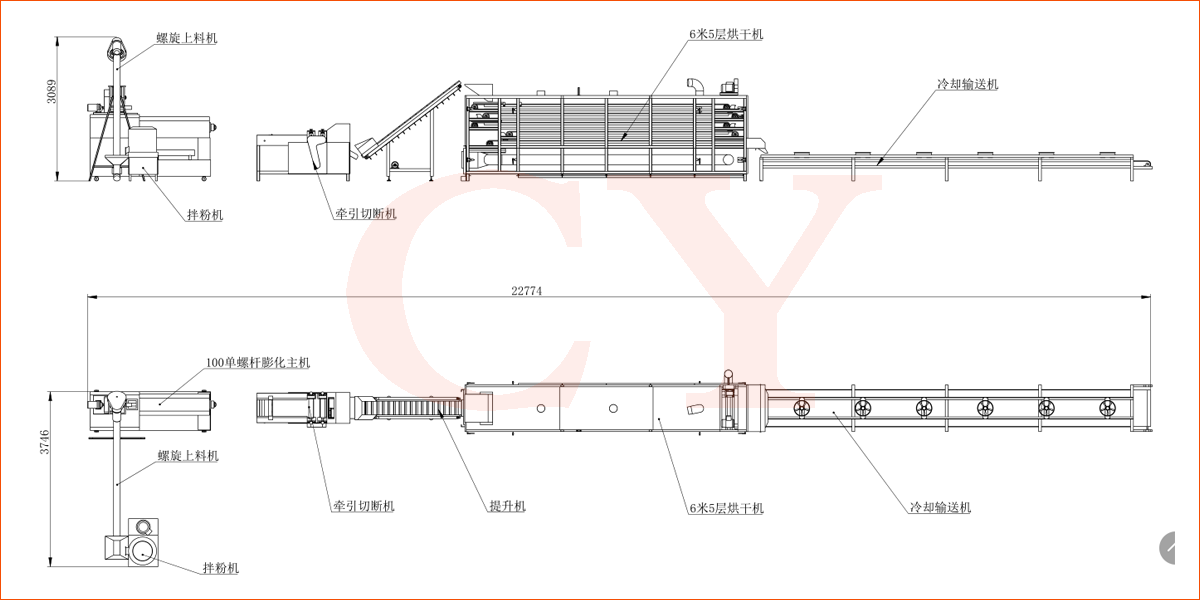 拌粉機→螺旋上料機→雙螺桿膨化機→切斷機→提升機→烘干機
