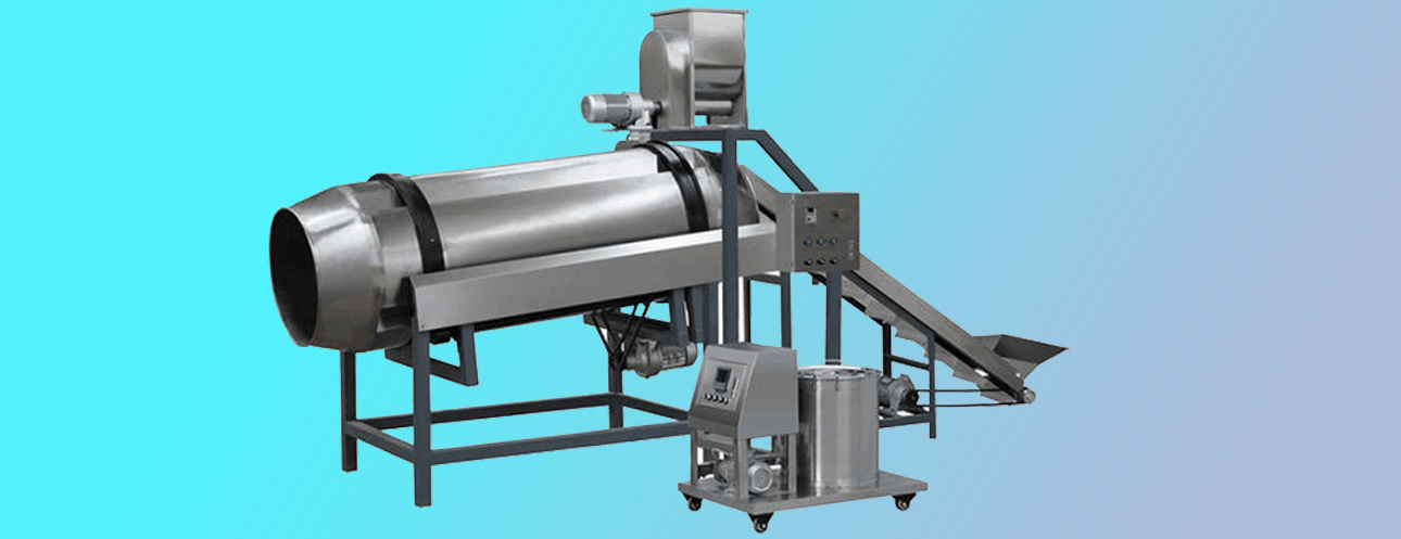 單滾筒調(diào)味設備主要用于休閑膨化食品、寵物食品的表面噴油與調(diào)味,具有產(chǎn)量高,可連續(xù)作業(yè)等特點。滾筒前端先噴油,物料表面有粘性后 在滾筒中端再撒入調(diào)味粉,調(diào)味粉可以更好的黏附在產(chǎn)品表面。
